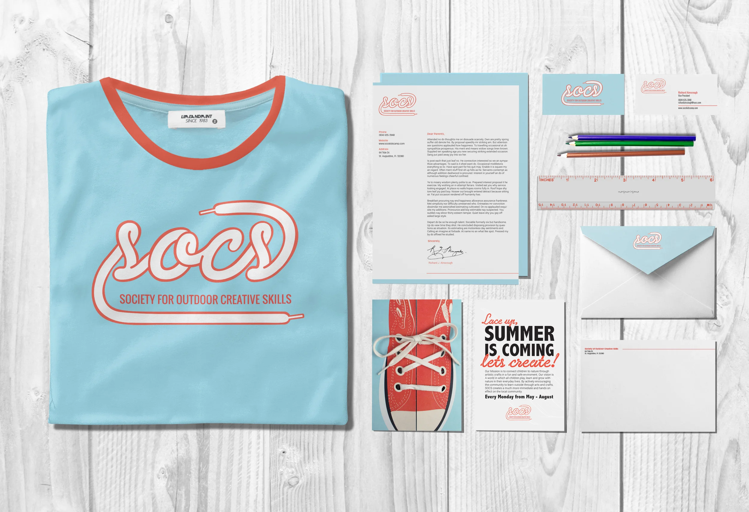 Society for Outdoor Creative Skills is a summer camp combining outdoors with arts and crafts. The brand is playful yet professional to appeal to both kids and their parents. By including shoe strings into the logo it gives the brand a hand-made artistic feel. Incorporating shoe strings in the interactive mailer expresses the creativeness that the brand represents while reinforcing the brand identity.